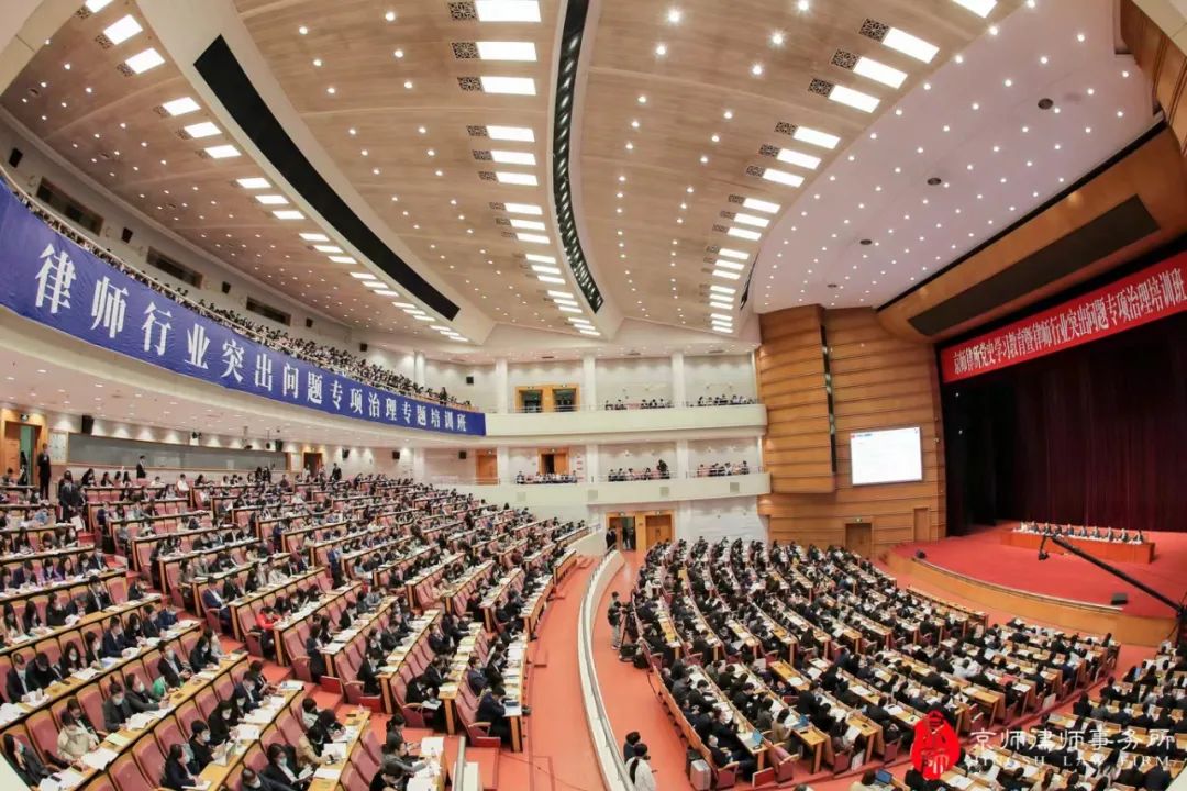 为深刻学习领会习近平总书记在党史学习教育动员会上的重要讲话精神,严格贯彻落实市区司法局要求的:各律师事务所要把自查核查工作与学习教育有机结合,确保“律所党组织负责人讲1次专题党课、律所负责人讲1次职业道德专题课、每名律师学习教育不少于10学时”的要求,2021年4月25日京师律所在北京会议中心举办为期一天的培训大会,对专项治理工作进行再培训、再落实,签署承诺书,并邀请中央党校胡建淼教授讲授习近平法