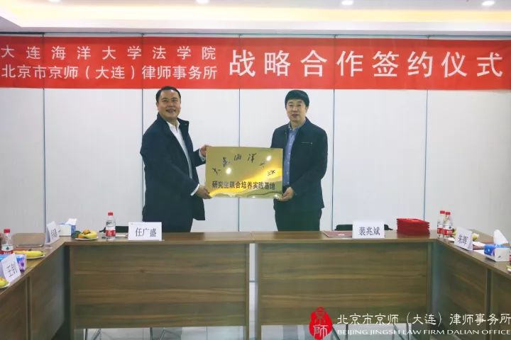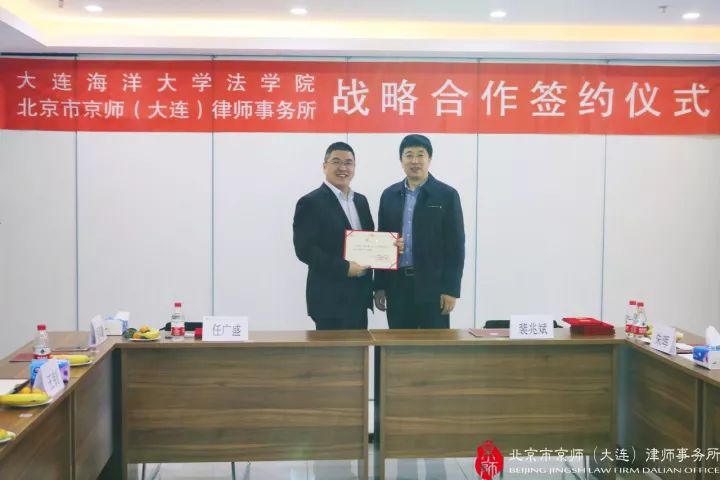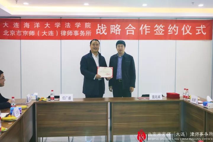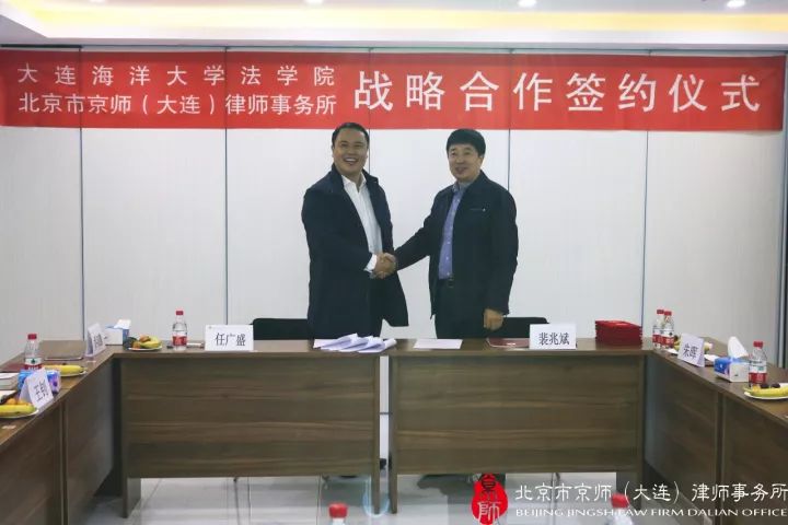 京师大连分所管委会主任任广盛律师与大连海洋大学法学院法警学院院长裴兆斌博士共同签订战略合作协议。