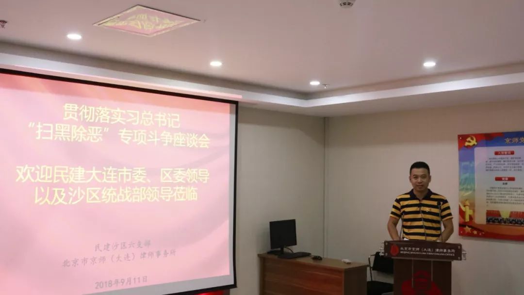 近日、为深入开展扫黑除恶专项行动,认真贯彻党的十九大精神,坚持以习近平总书记新时代中国色社会主义思想为指导、由大连民建沙区六支部组织、在北京市京师(大连)律师事务所举行“扫黑除恶专项座谈”。