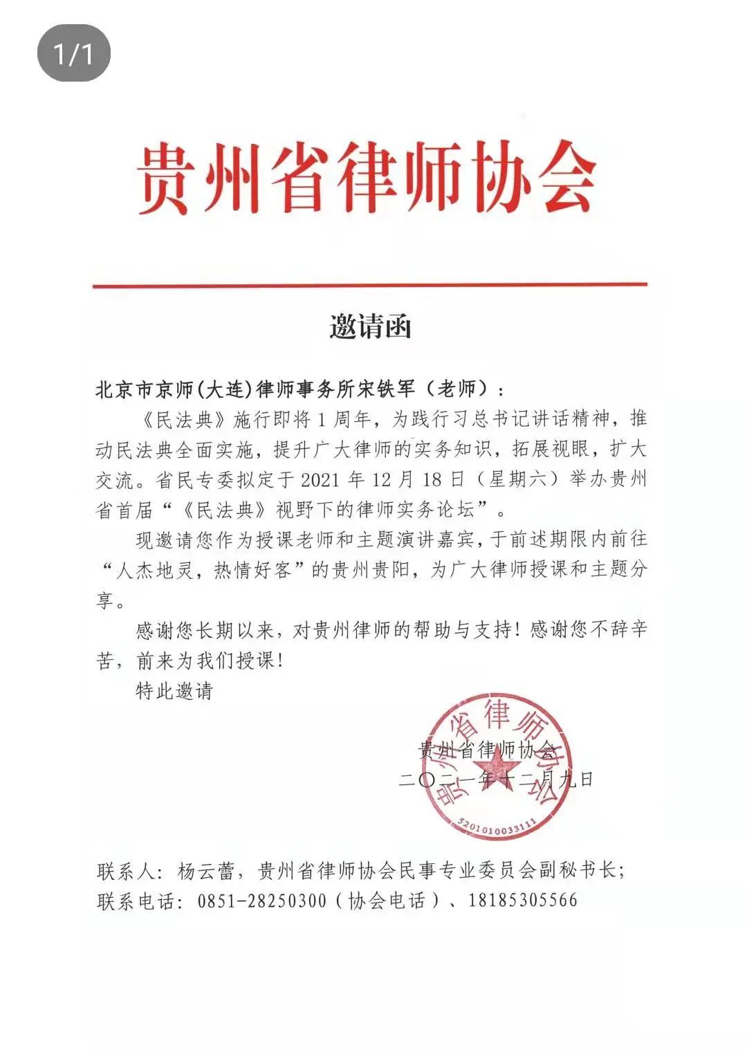 为庆祝《民法典》颁布和施行一周年,践行习近平总书记贵州讲话精神,推动民法典全面实施,由贵州省律师协会主办、贵州省律师协会民事专业委员会承办、贵州秉尚律师事务所协办的2021年贵州省“《民法典》视野下的律师实务论坛,于2021年12月18日顺利举行。在活动中,来自全省各地市区县的1700余名律师,通过线上+线下学习等方式集中“充电”。北京市京师(大连)律师事务所党支部副书记、全国律协民委会委员宋铁军律师作为受邀嘉宾之一参会